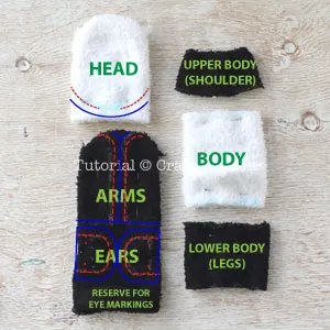 Cut eye markings from the heel part of the black sock, bigger than the template. Trace and cut the white of eyes from felt.