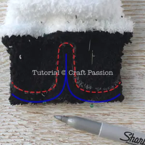 Trace the template outlines on the wrong side of the socks, these lines are the sewing lines (red dashed lines) as shown in the picture.