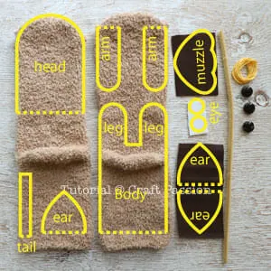 - Print out the pattern, cut out the templates, and trace them on the intended materials. Draw pattern on the sock. Sew then cut. Turn sock pieces right side out.