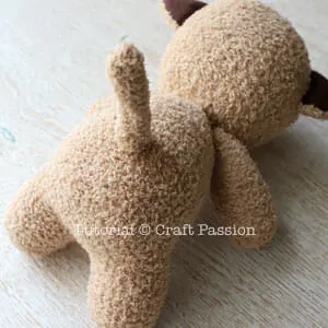 I purposely position the ear in the way that it shows the brown felt on the outside because pug has a darker color at the outside of the ears. But it is not wrong to do it the other way round, just like I did for the dark brown sock puppy.