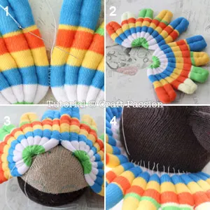 1. The sock turkey is so happy that it has a beautiful and colorful tail. Next, we are going to give it a pair of bigfoot legs.