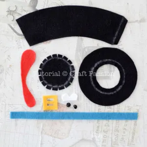 Trace the top hat, eye and snood templates on the felts. Add 1/4″ seam allowance for the top hat template as shown in the picture.
