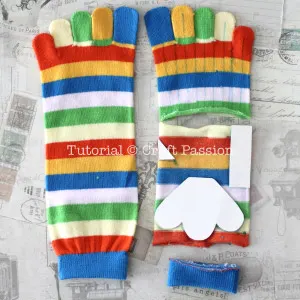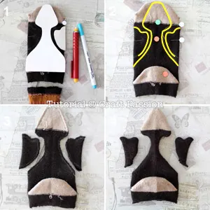 - Print out the pattern, cut out the templates and trace them on the materials. Draw pattern on the sock. Sew then cut. Turn sock pieces right side out.