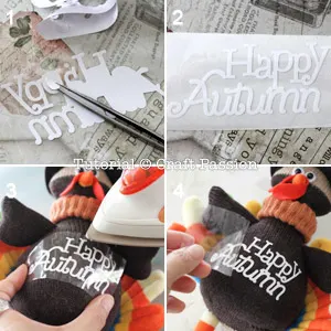 2. A clean “Happy Autumn” iron-on decal is really to be transferred to the belly of the sock turkey.