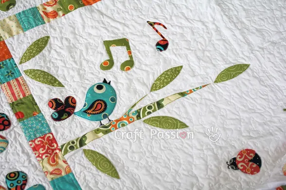 The photo shows the appliques of the songbird and tree branch after completion with the trapunto quilting method.songbird applique