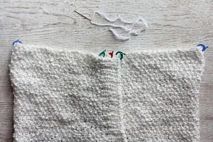 - Fold the pillow knit piece into 3 parts, overlap at the ribbing, with the ribbing that has buttonholes at the top.
