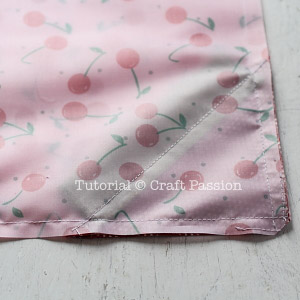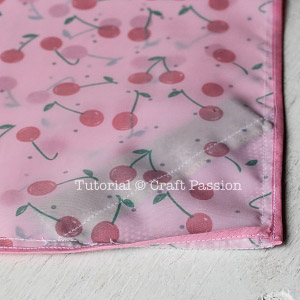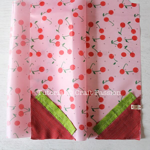 I used nylon/polyester woven fabric which is thin but strong bought from Daiso. Daiso is a Japanese Yen Shop that’s similar to Dollar Store, just in case you are wondering. You may use cotton or even an old T-shirt to sew it. T-shirts or heavier fabrics will need a bigger strawberry bag to store, so please adjust the size a little bigger.