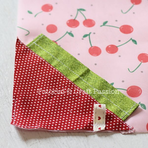 Place the strawberry piece to the bottom corner of the grocery bag, baste it in place at seam allowance. Fold the ribbon into halve and baste it near to the hull (side seam).