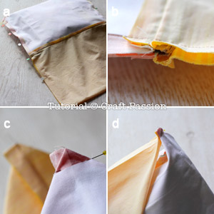 d.) Flatten the base of the bag to form a triangle at the corner of the side seam. Flatten the lining’s base to form an exact triangle. Pin both triangles together and sew. Repeat the same to the other base’s corner.