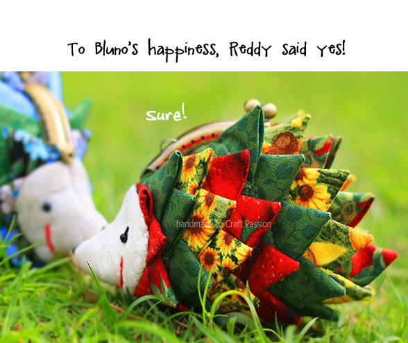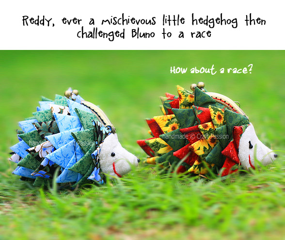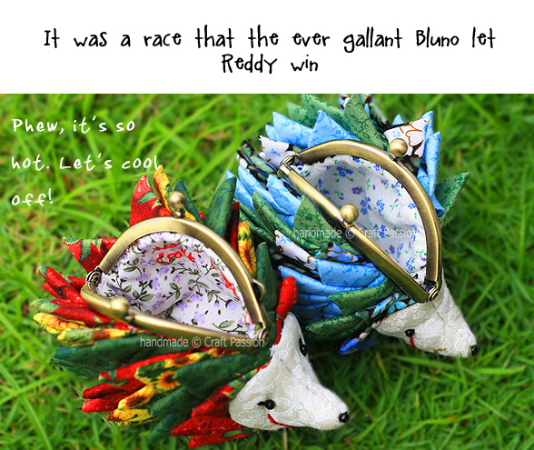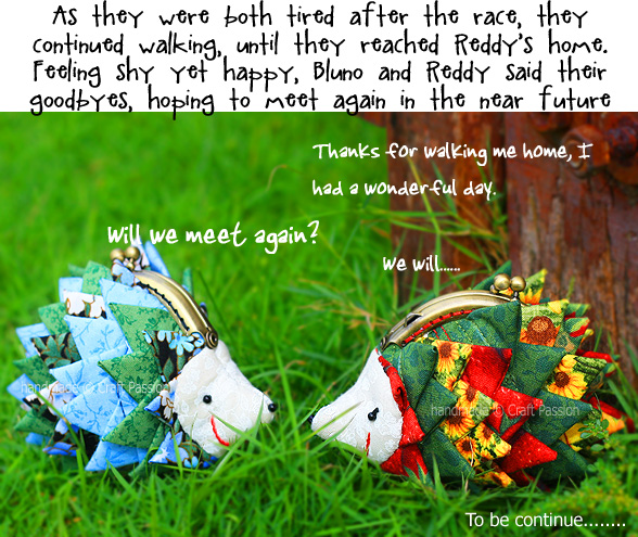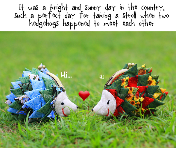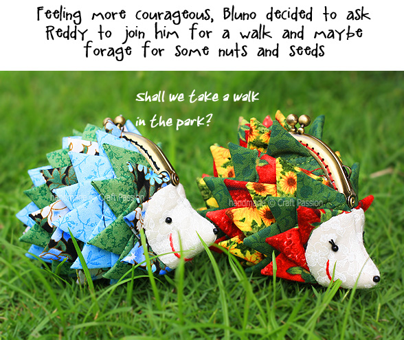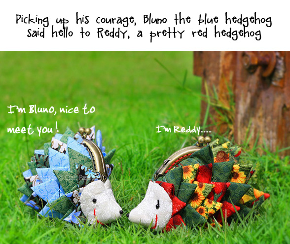 I really am in “spiky” fever these few days after making the Triangle Fold Coaster. I transformed those “spikes” into 2 hedgehog purse s, which I have named Bluno and Reddy. They measure only about 10cm x 9cm. Bluno is a male hedgehog and Reddy is a female. They met each other in the park on one sunny morning, and this is how their story begins….. click “Next” below the photo to view the full storyboard of their meet-up.