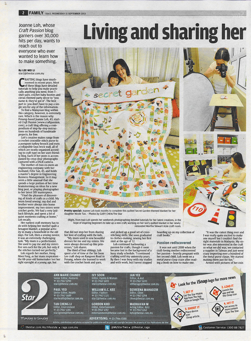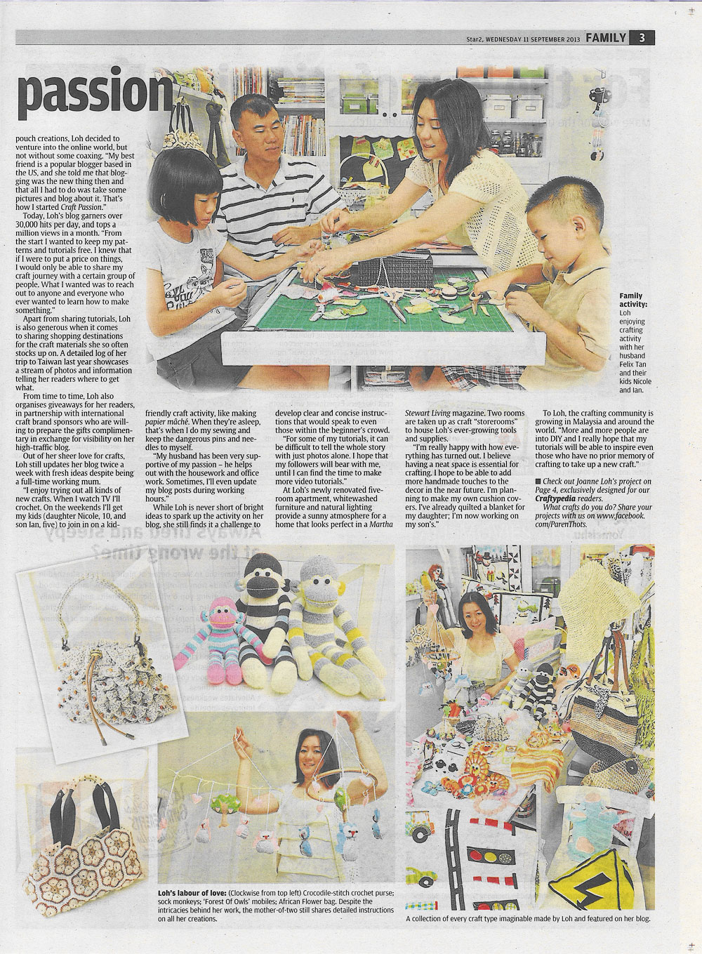 Thank you to all my friends, fans, readers, visitors, relatives, and families, for reading September 11, 2013, The Star Daily about the newspaper interview and feature! It is a huge blessing for my family and me to receive your phone calls, comments, and best wishes. Without your support, Craft Passion wouldn’t develop and sustain till today! Thank you very much and we love you all!