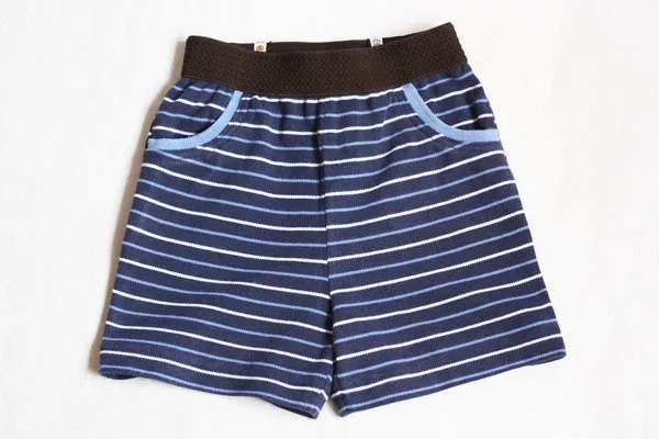 Go grab an old unwanted jersey polo shirt, ripped it off, and sew it into a pair of knit shorts for your boy.