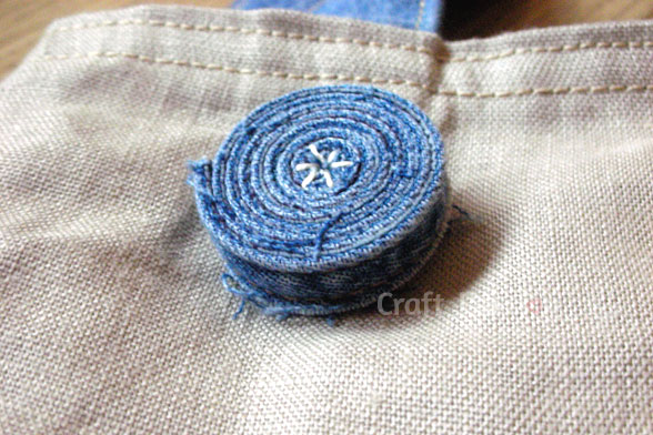 And, this little rolling reel is made from the side seams of my jeans. Just roll it up and bond it with fabric glue, sew it on the recycled material Tote Bag by making a few decorative stitches at the center of this seam reel. I was inspired by Polka Dot Pineapple when Lettie showed us how to make a coaster out of the seams of the jeans.