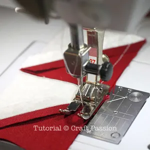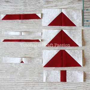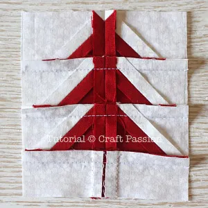 b. Piece the red trunk in between the 2 whites with 1/4″ seam allowances on each side.