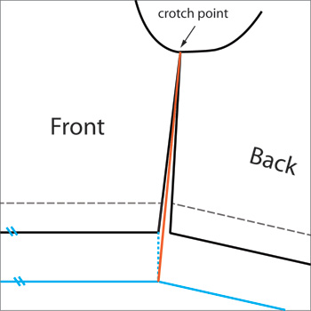 3. Draw a new extended inseam line starts from the crotch point to the new finish hem. {Orange line}