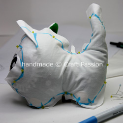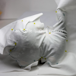 Wrap the plush toy as flat as possible with white fabric and secure it with pins.
