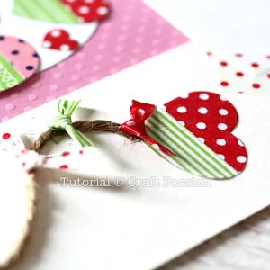 To make the heart balloon on the card trim: Glue a heart on the card trim, and glue a jute string at the bottom, then glue the washi bow on the jute string.