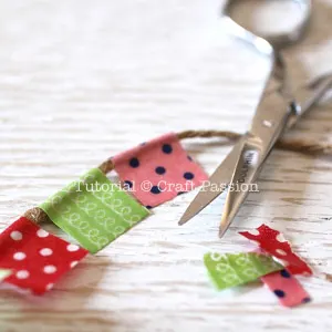 Cut a short length, approx. 8″ long of jute string. Wrap washi tape around it, about 3/4″ each color.