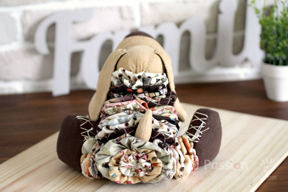 Tie the legs of the plush dog to the body at #6 yoyos and #16 yoyos from the neck.
