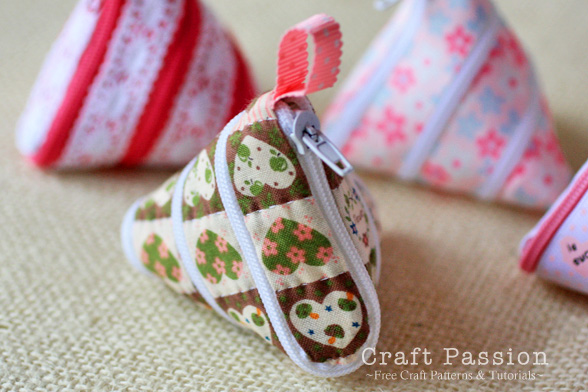 This cute little triangle coin purse is truly an amazing and creative handmade design… zip it up to a tetrahedron-shaped coin purse, and unzip it to a long ribbon. This zip-itself coin purse is made from 2 simple materials that you can get from the shop easily – ribbon and zipper. If you wish to line the small little purse, then you need an additional fabric strip or more ribbon, but I personally think that this small change pouch looks fine without the lining.