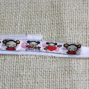 b. Lay the ribbon slightly over the marking. If the ribbon has a direction (in this case, the Pucca doll), the bottom edge should point to the zipper.