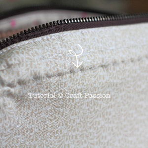 4. Sew Zipper Gusset. Close the zipper and make a few stitches near the top stop of the zipper.