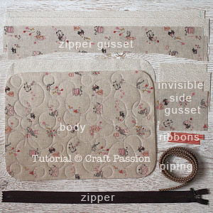 3. Cut Fabric. Fuse the interfacing onto the wrong side of the lining fabric for the zipper-gusset and the invisible side-gusset. I like my interfacing on the lining when I need to do a lot of turning right-side out.